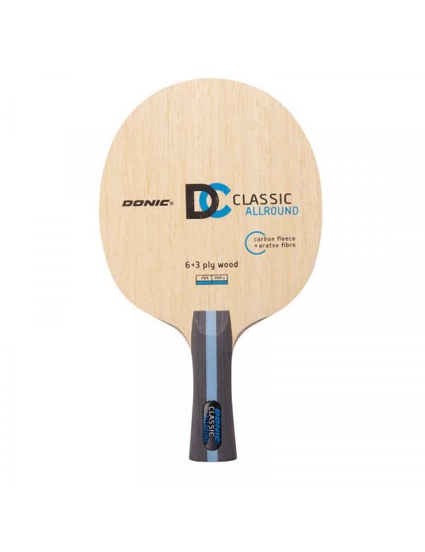 Déjà, le noyau du DONIC CLASSIC ALLROUND nous montre à quel point les matériaux modernes se distinguent de celles des générations précédentes. La fibre ARATOX intégrée est plutôt une couche collante qu’un placage au sens traditionnel du terme et elle n’est pas comparable aux couches de carbone classiques du passé. L’intégration de bois avérés comme le Limba et le Koto mais surtout la combinaison harmonieuse de tous les matériaux donne un résultat qui transmet le meilleur contrôle possible mais aussi la vitesse requise et le toucher attendu.Technologie : 9 plis en Aratox, Awan (4+6), Limba (3+7), Soft Carbone (2+8) et Koto (1+9)Caractéristiques : bois de tennis de table de dureté moyenne, un bon contrôle, un bon toucher.A conseiller : aux joueurs offensifs et allround, au jeu précis et à la prise d’initiative contrôlée. Droit, concave, anatomique